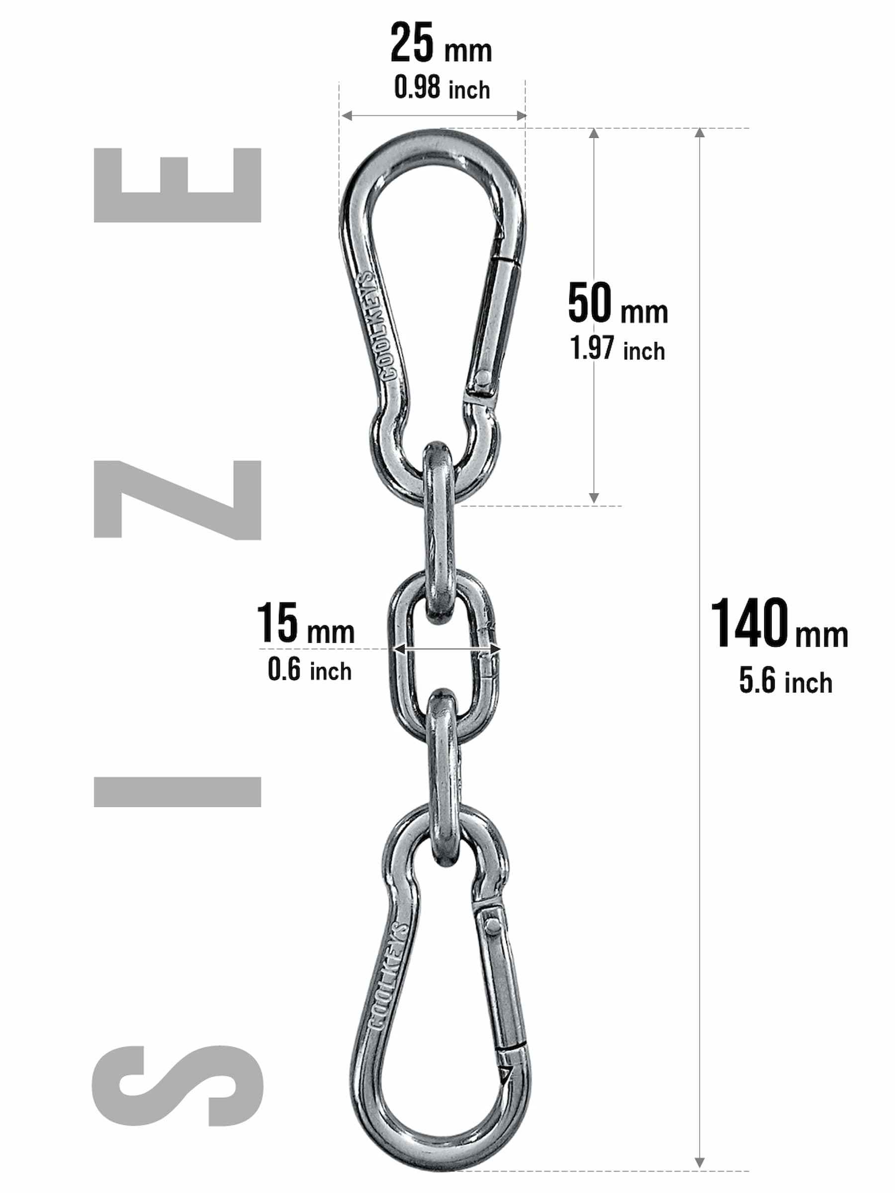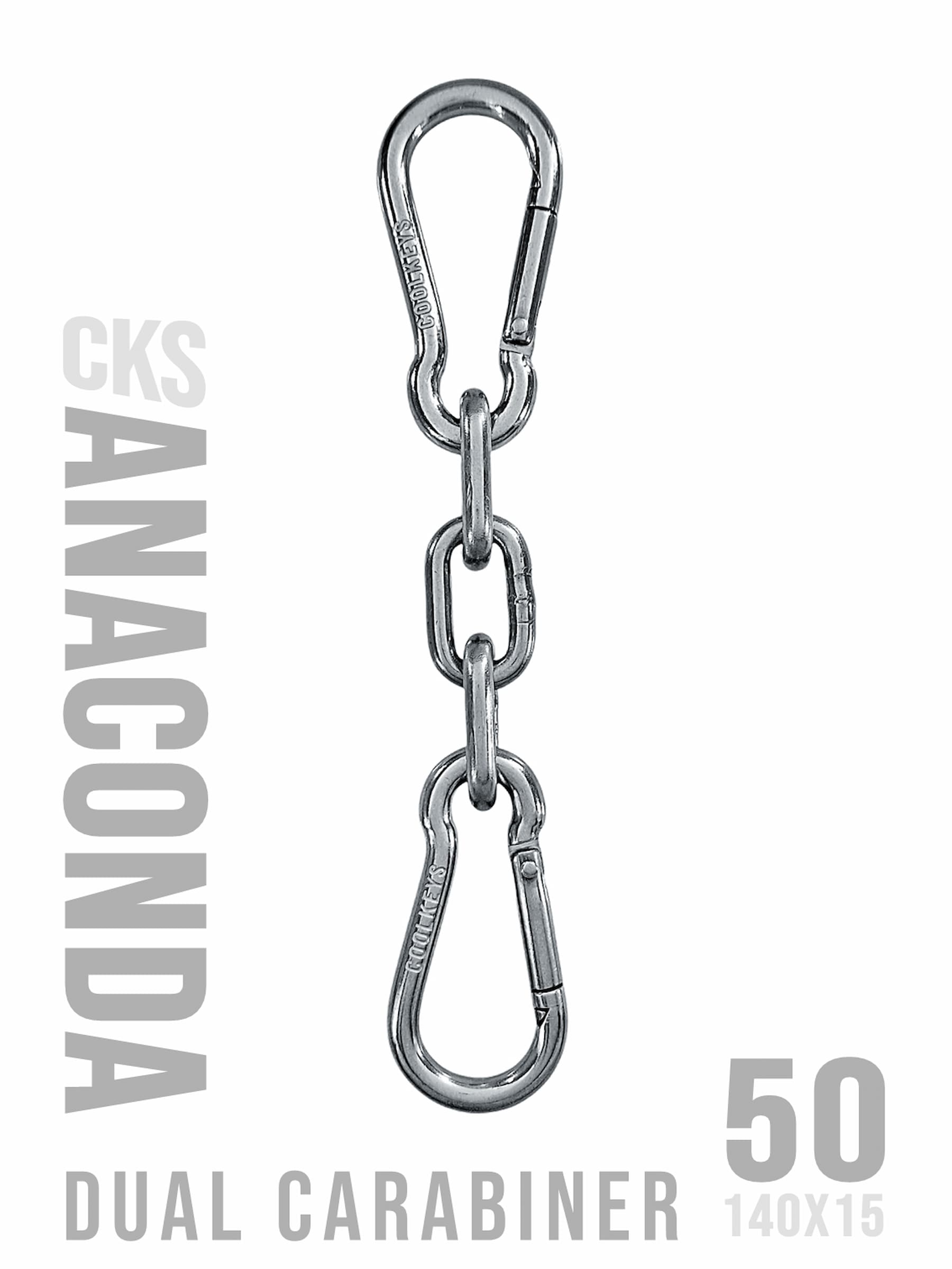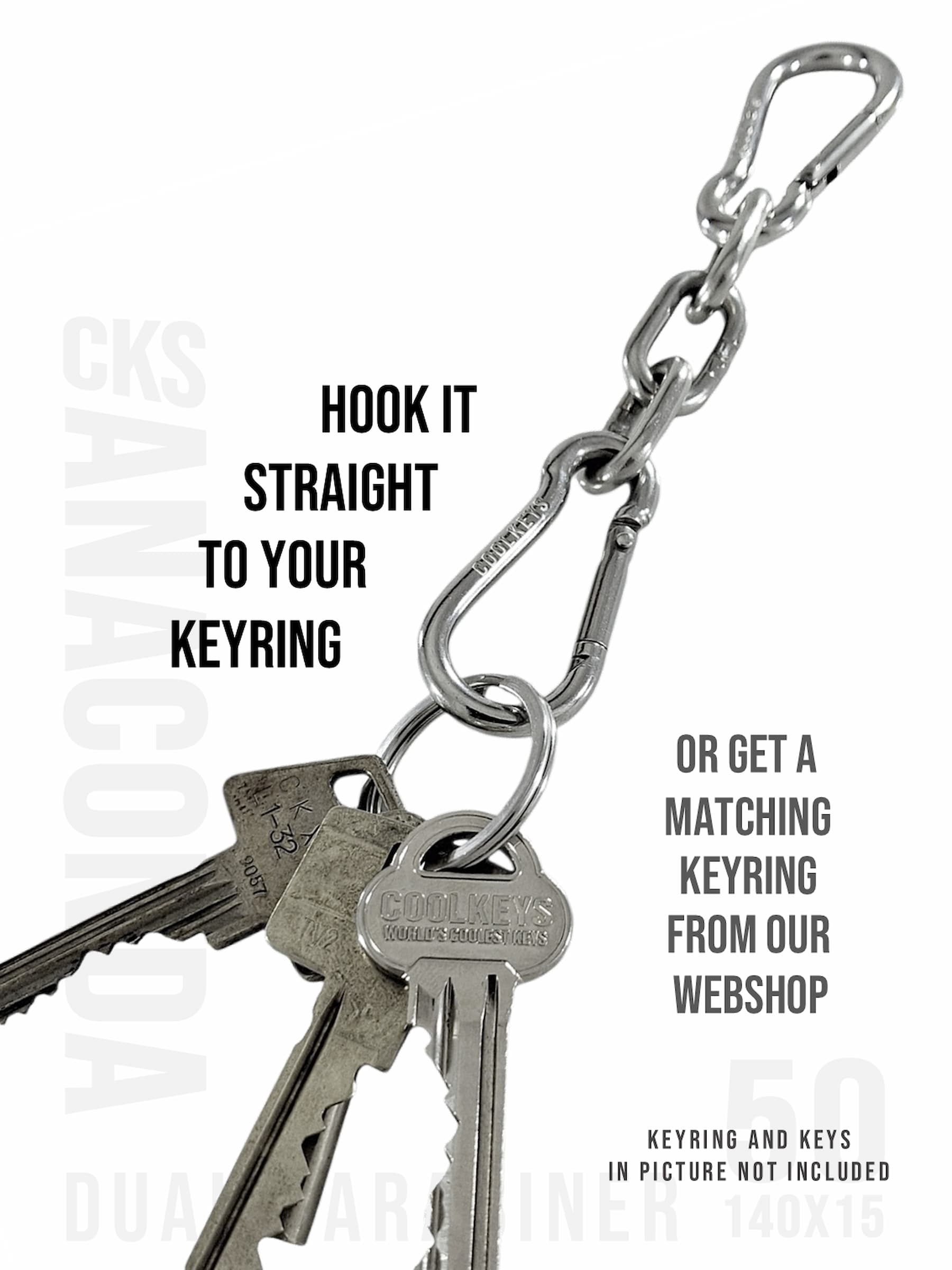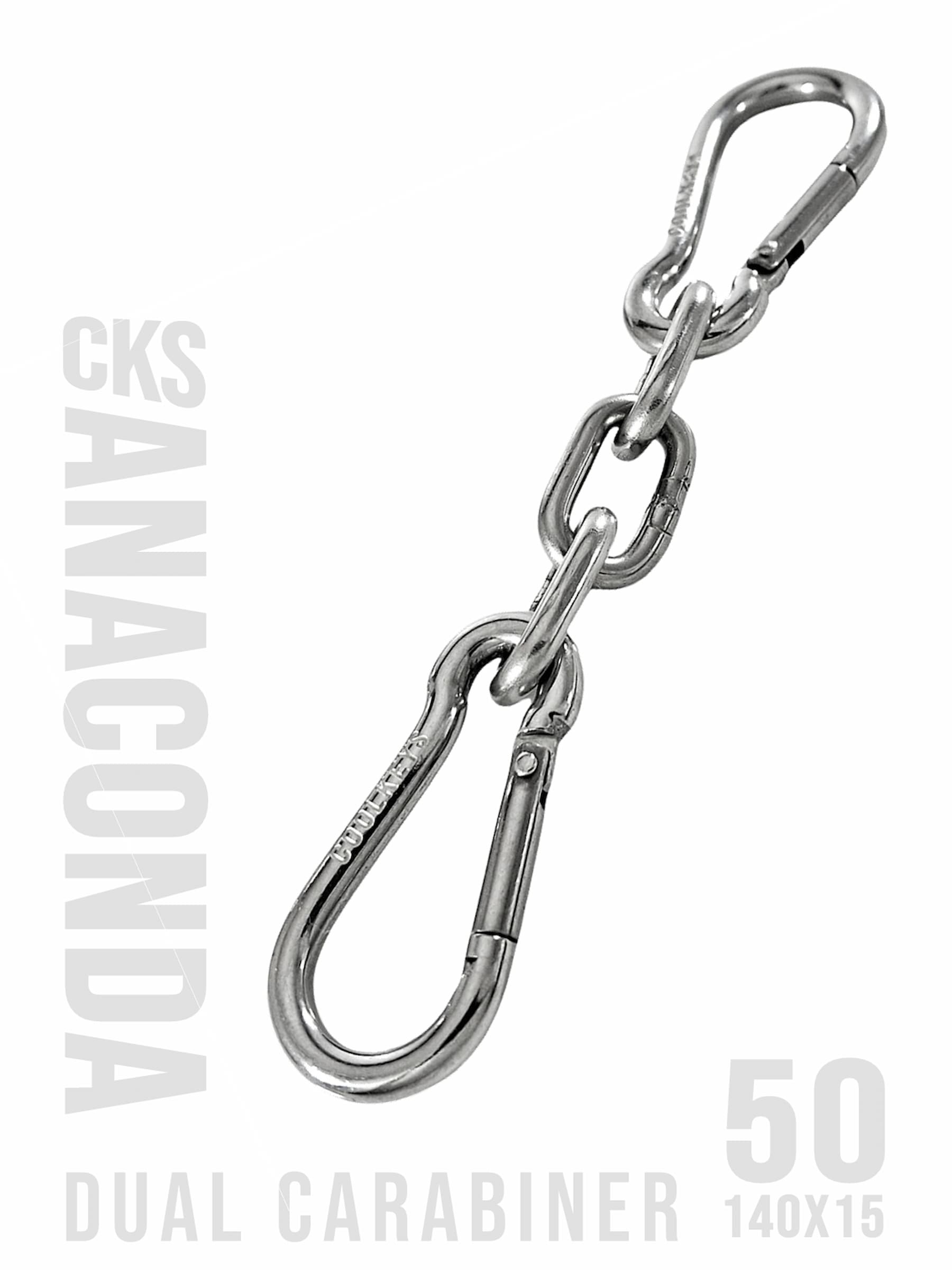 2st 50 mm karbinhakar sammanlänkade med en kort 15 mm bred Anaconda kedja. Kan användas för att bära dina nycklar säkert inuti eller utanför dina byxor eller väska. Men kan även användas på olika sätt för andra ändamål hemma, på jobbet etc. En multifunktionell snygg hake.
