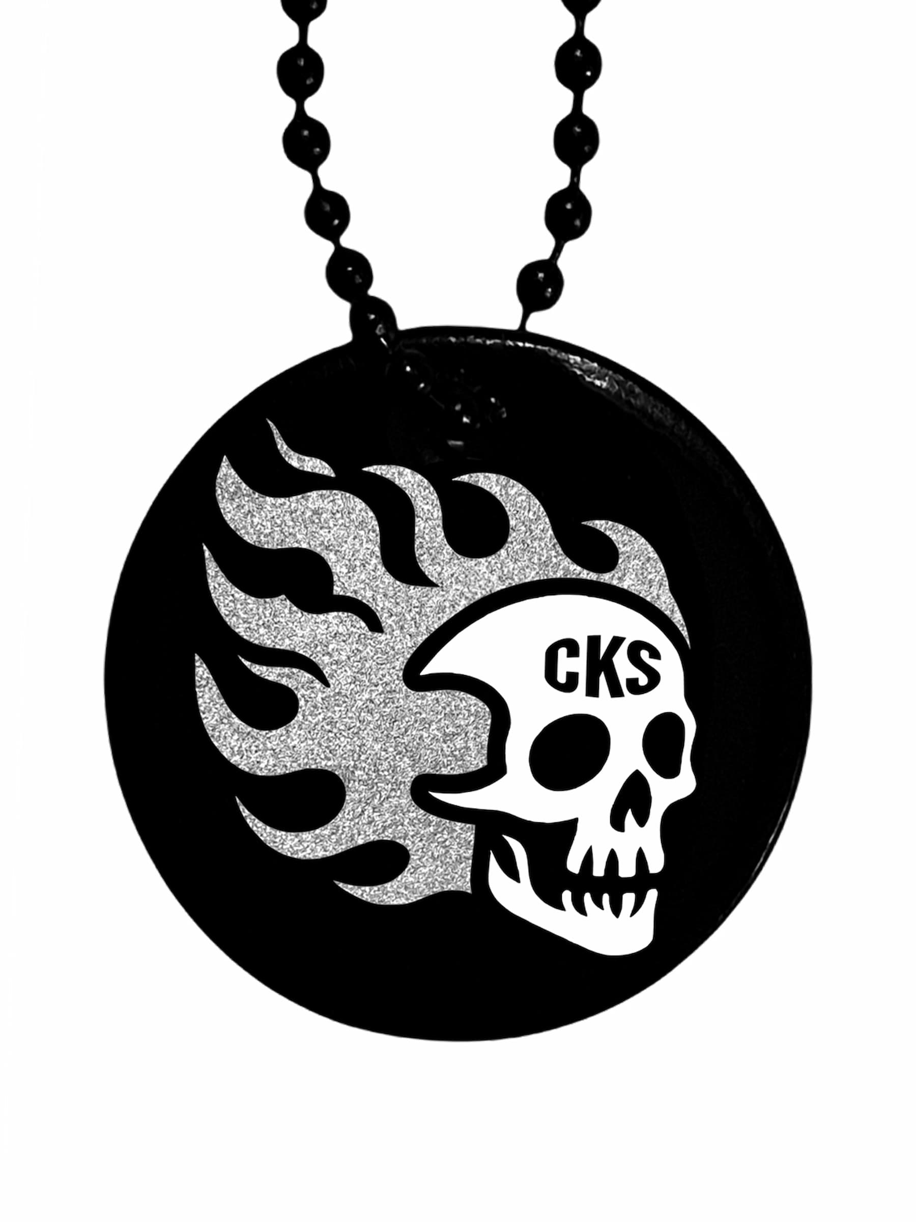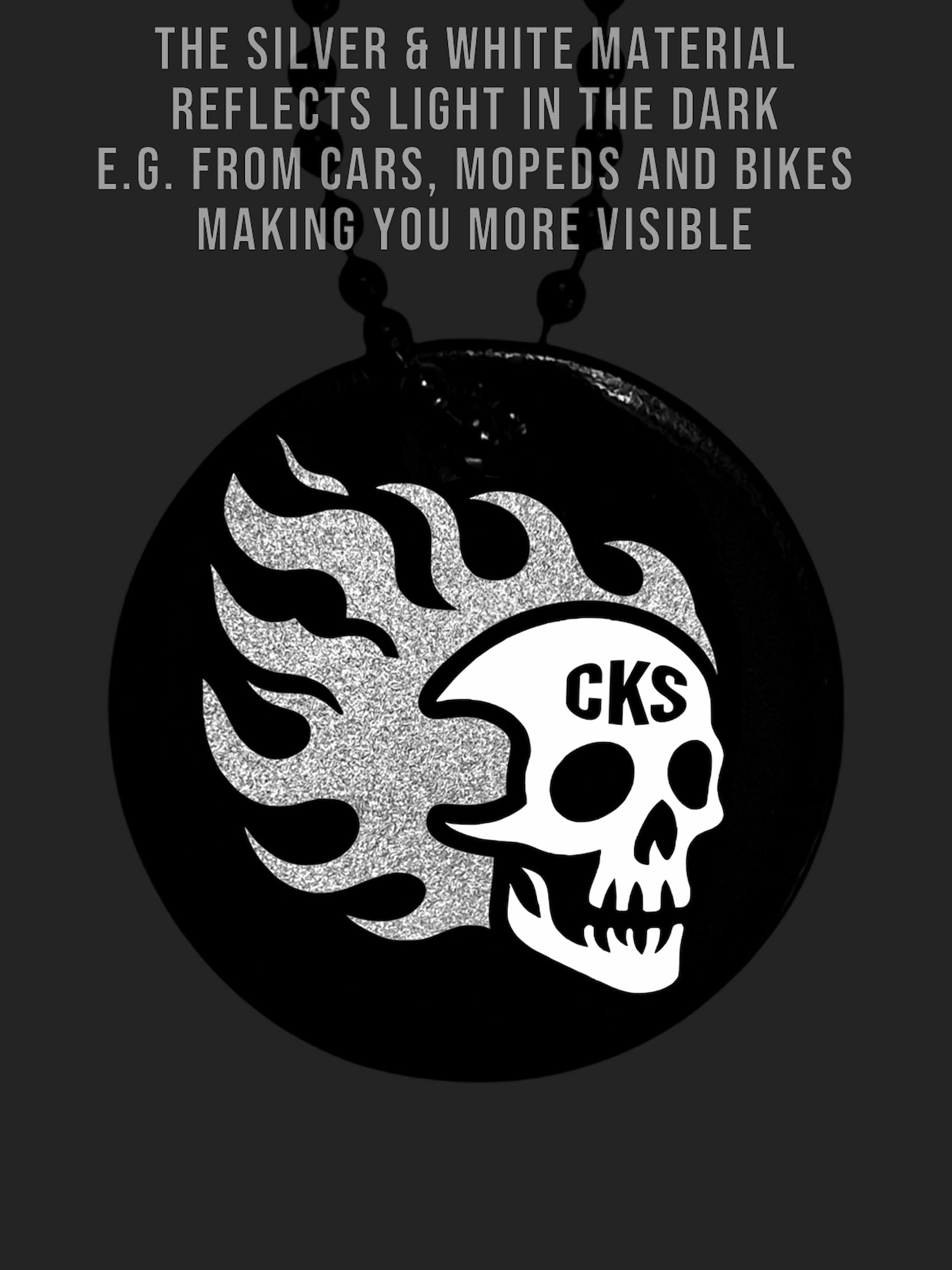 Rund svart reflex med en brinnande döskalle i klassisk tatueringsstil. Hakas enkelt direkt på en ryggsäck, väska, dragkedja, jacka, nyckel-/mobil-/plånbokskedja, husdjurkoppel, barnvagn etc. Det silvriga och vita färgade materialet reflekterar ljus i mörkret från t.ex. bilar, mopeder och cyklar, vilket gör bäraren mer synlig. Se våra videor för att se den in action och reflex effekten.