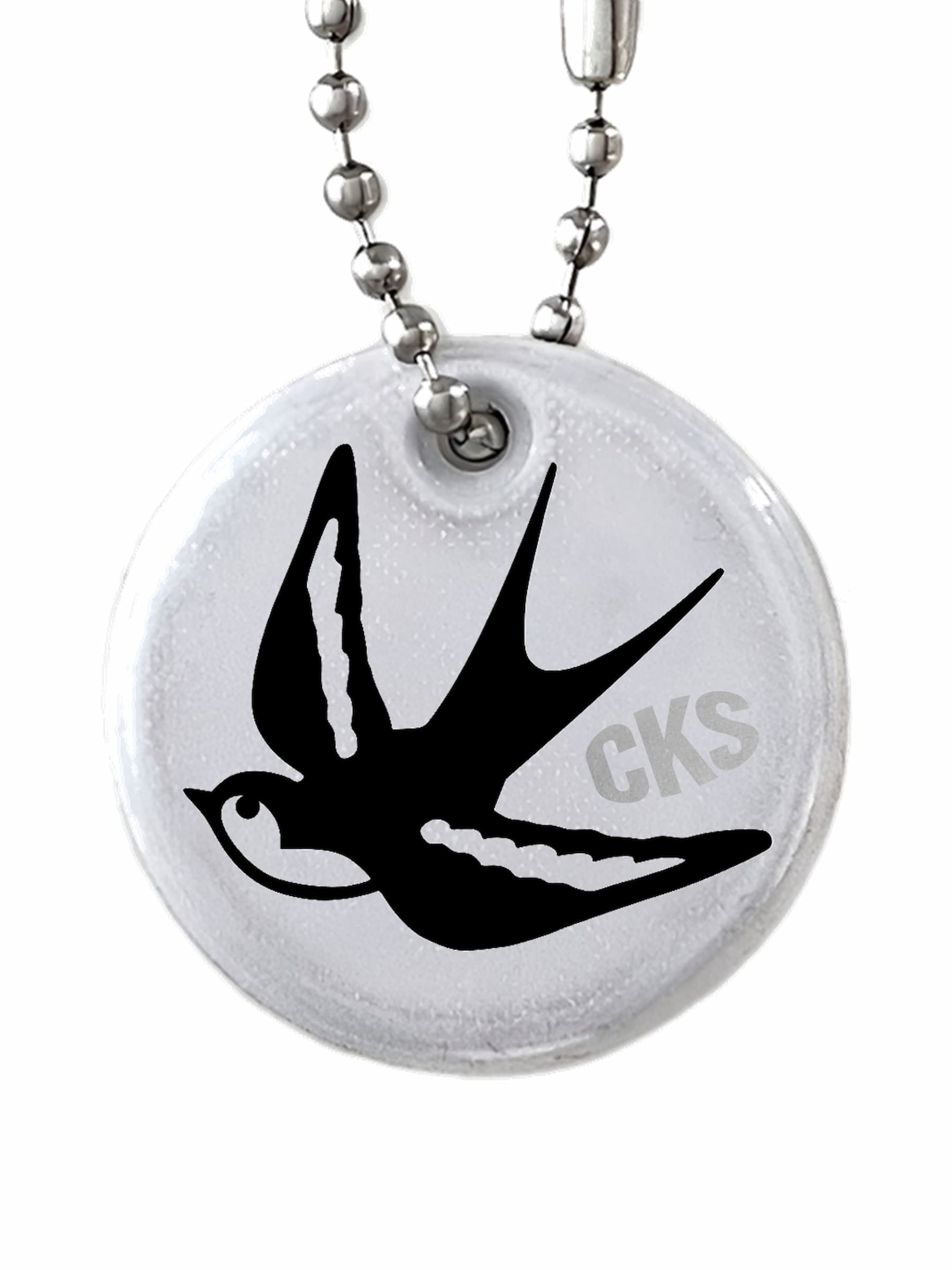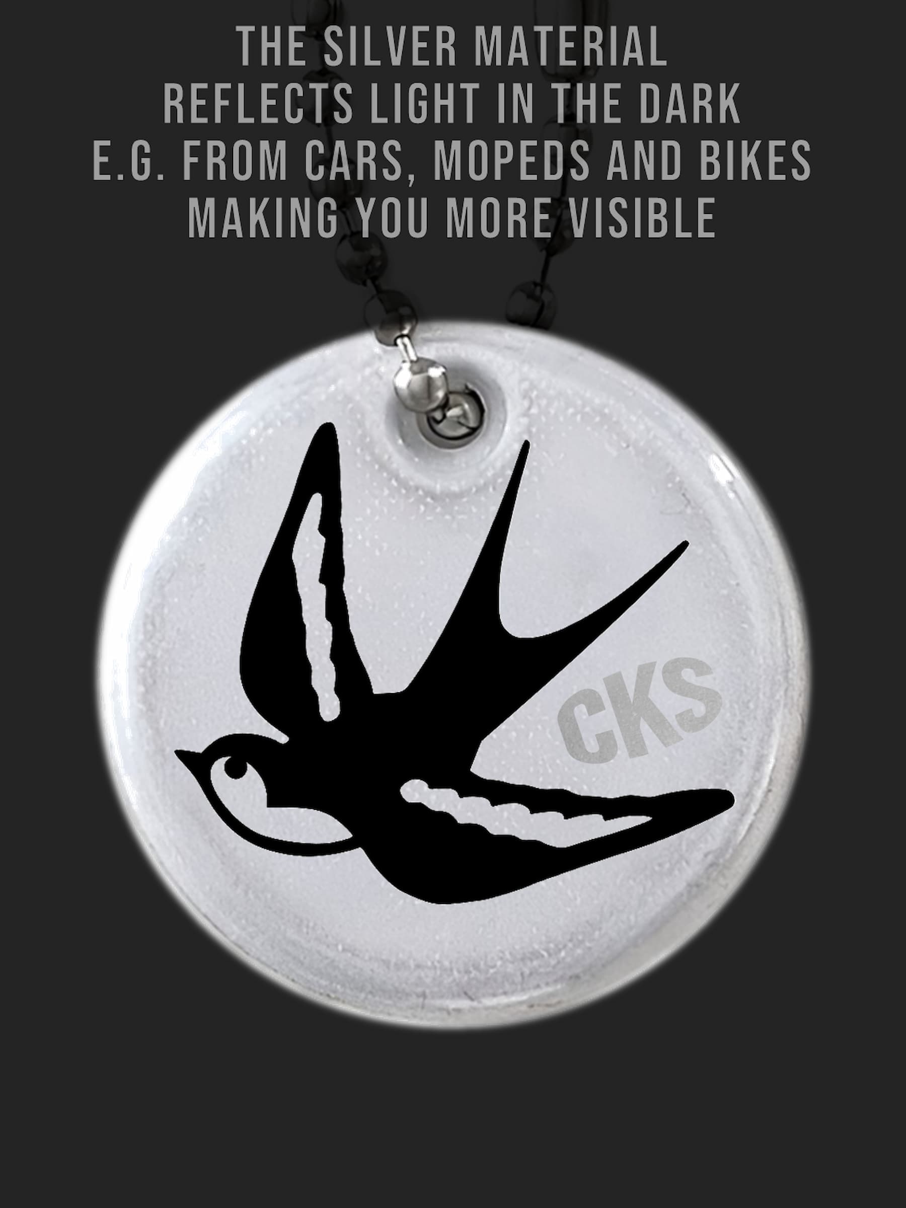 Rund reflex med en svala i klassisk tatueringstil. Hakas enkelt direkt på en ryggsäck, väska, dragkedja, jacka, nyckel-/mobil-/plånbokskedja, husdjurkoppel, barnvagn etc. Det silver färgade materialet reflekterar ljus i mörkret från t.ex. bilar, mopeder och cyklar, vilket gör bäraren mer synlig. Se våra videor för att se den in action och reflex effekten.