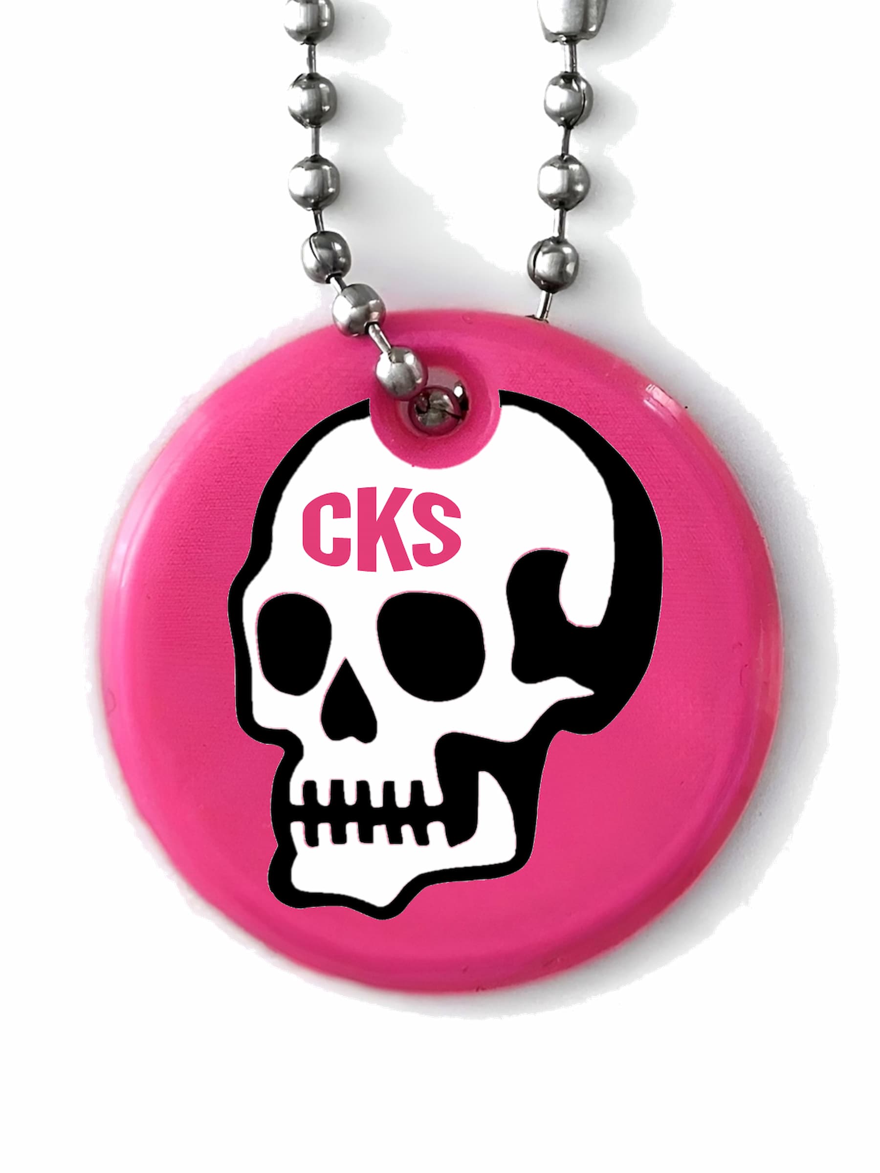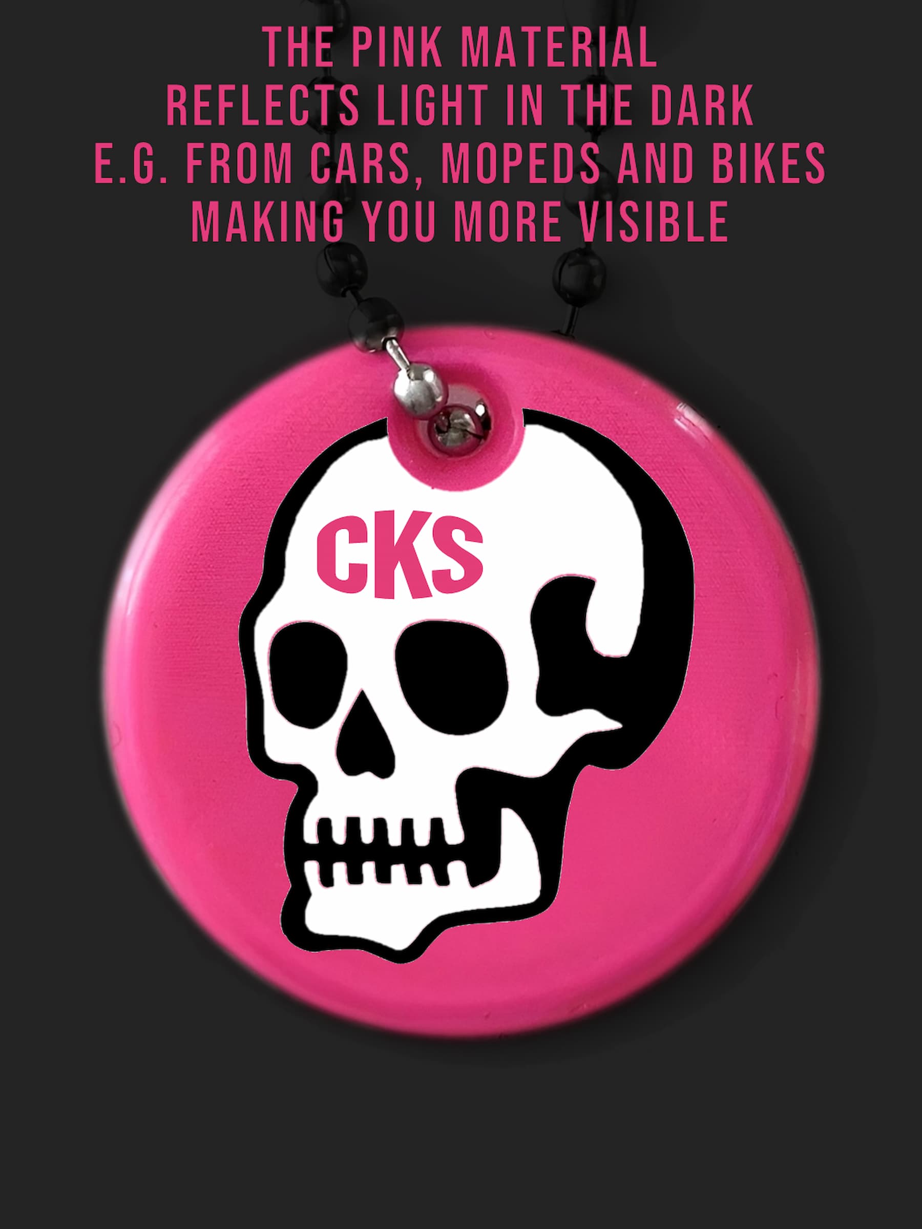 Rund rosa reflex med en döskalle i klassisk tatueringsstil. Hakas enkelt direkt på en ryggsäck, väska, dragkedja, jacka, nyckel-/mobil-/plånbokskedja, husdjurkoppel, barnvagn etc. Det rosa och vita materialet reflekterar ljus i mörkret från t.ex. bilar, mopeder och cyklar, vilket gör bäraren mer synlig. Se våra videor för att se den in action och reflex effekten.