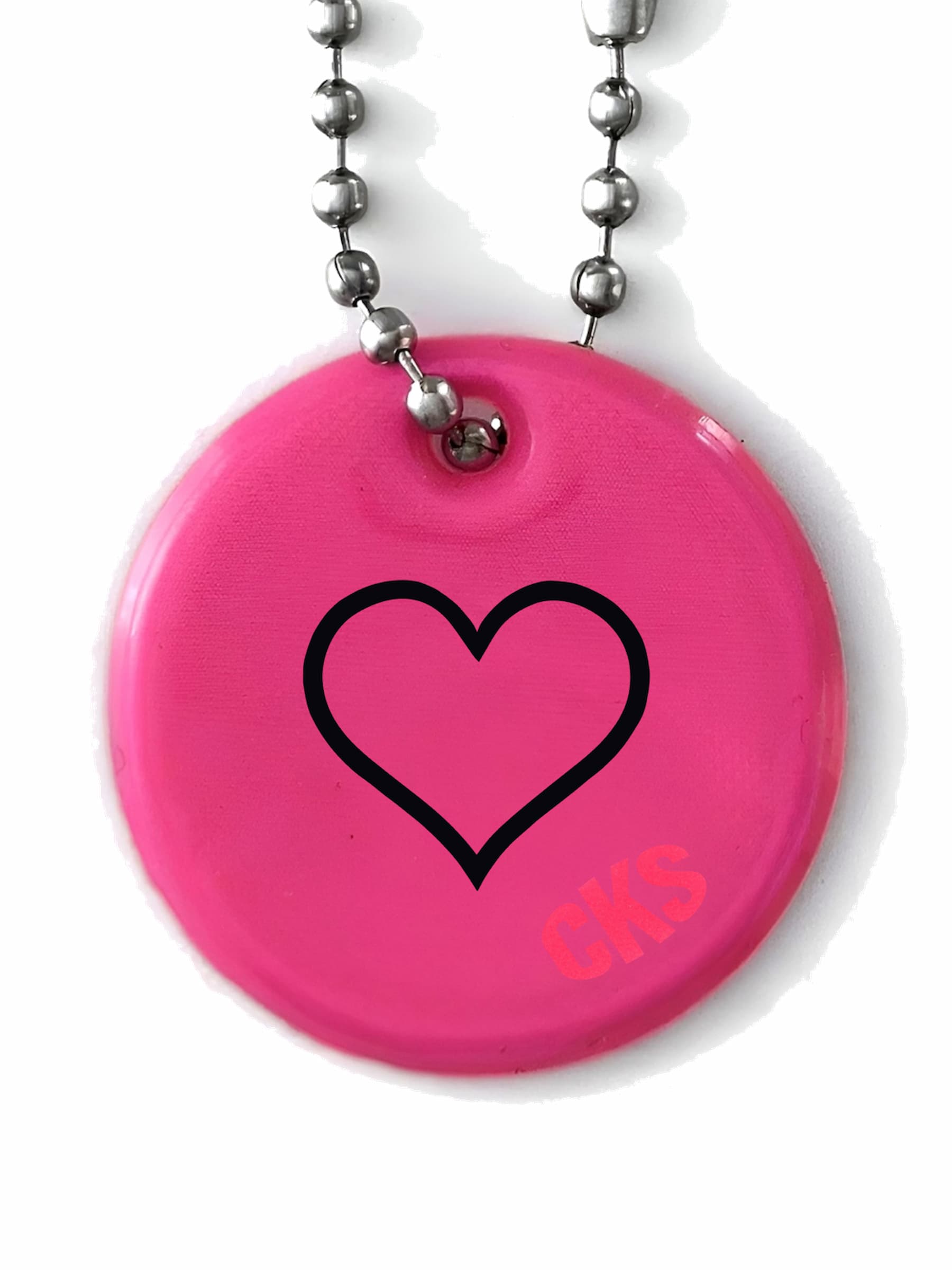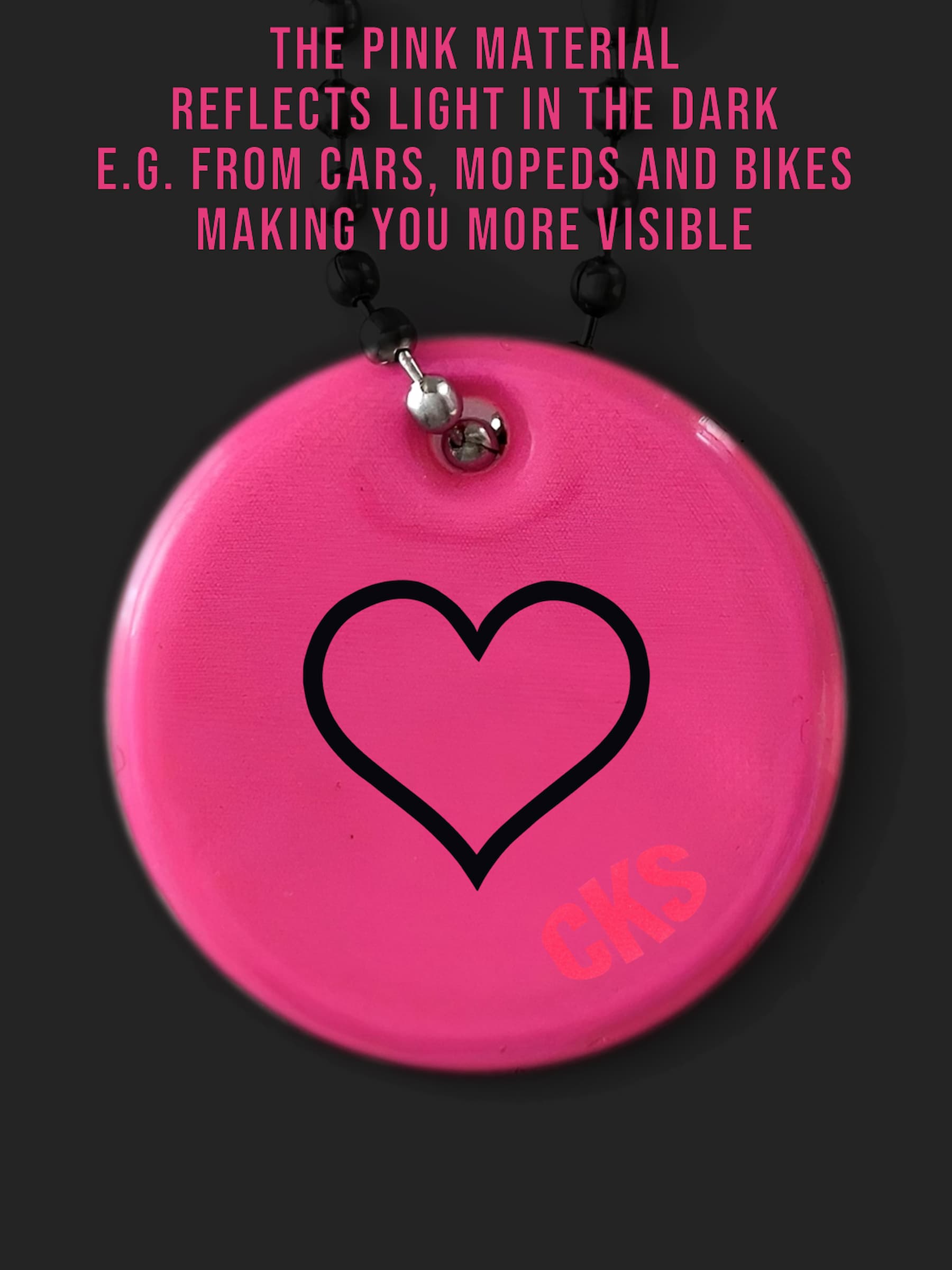 Rund rosa reflex med ett mini hjärta. Perfekt present till nån du tycker om. Hakas enkelt direkt på en ryggsäck, väska, dragkedja, jacka, nyckel-/mobil-/plånbokskedja, husdjurkoppel, barnvagn etc. Det rosa färgade materialet reflekterar ljus i mörkret från t.ex. bilar, mopeder och cyklar, vilket gör bäraren mer synlig. Se våra videor för att se den in action och reflex effekten.