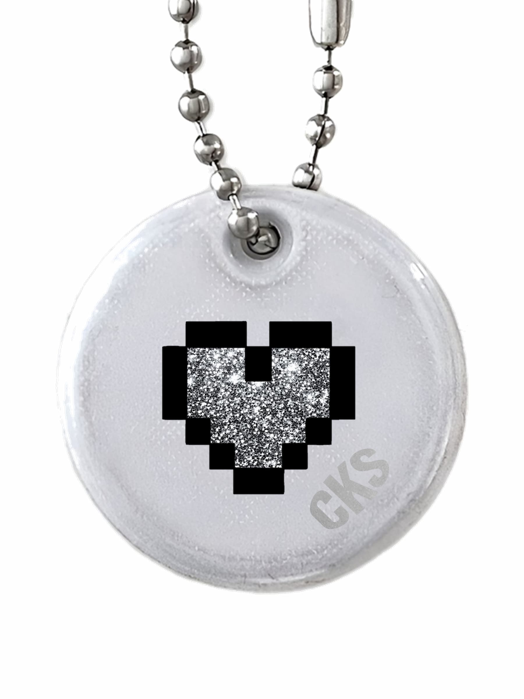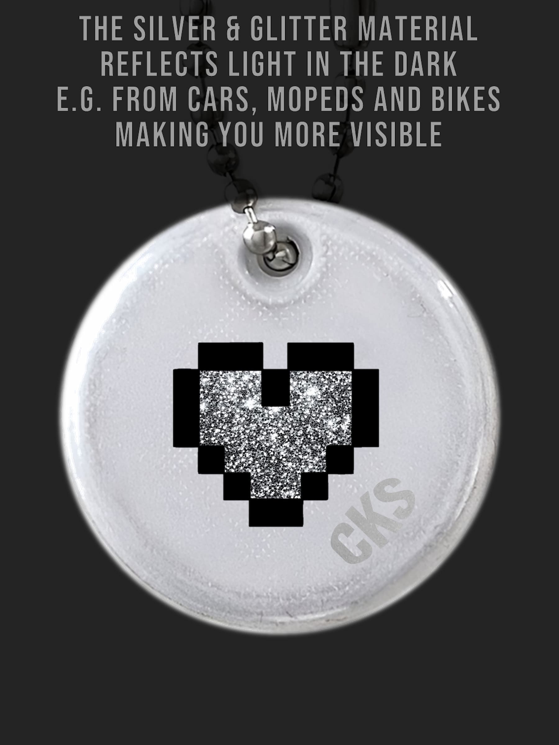 Rund reflex med ett litet pixel glitter hjärta. Perfekt present till nån du tycker om. Hakas enkelt direkt på en ryggsäck, väska, dragkedja, jacka, nyckel-/mobil-/plånbokskedja, husdjurkoppel, barnvagn etc. Det silver färgade & glitter materialet reflekterar ljus i mörkret från t.ex. bilar, mopeder och cyklar, vilket gör bäraren mer synlig. Se våra videor för att se den in action och reflex effekten.